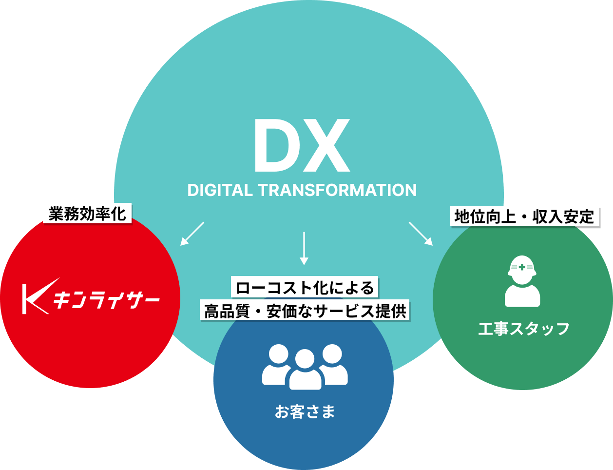 キンライサーは、DXの推進によってお客さま・工事スタッフ・キンライサーの3者にとってメリットを生み出すビジネス形態を構築していきます。